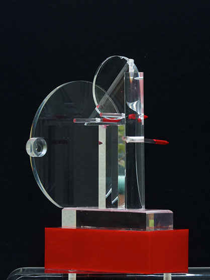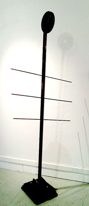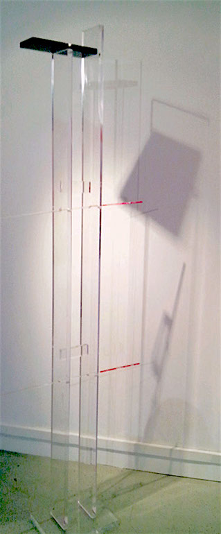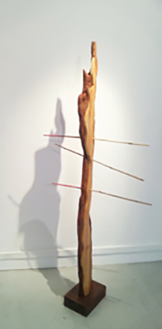 Les sculptures de bois et d’altuglas et de métal reprennent ce thème en le dépouillant à l’extrême. C ’est la métamorphose d’un être de chair en idée. Il reste du personnage la position debout, le transpercement, la blessure figurée par la goutte de sang.